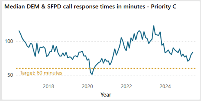 These call centers are overwhelmed by volume, yet 60-80% of calls come from the non-emergency line. As a result, wait times can become quite long. San Francisco, for example, has a target response time (includes answering the call and responding to it) of 60 minutes for non-emergency calls, a goal they’ve missed in 105 of the past 108 months!2 In 2025, even this 60-minute goal seems far too long to wait on hold for simple tasks that AI agents can now handle (with a 0 second wait time) given advancements in generative AI-powered voice technology.