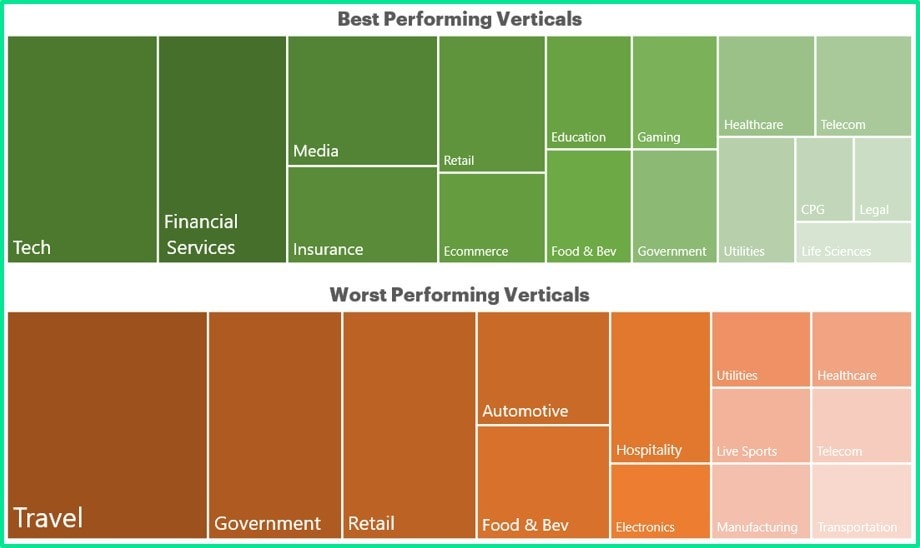 In examining the impact to specific verticals, we found that travel, government, and retail were the hardest hit end markets, while financial services and tech were relatively insulated.