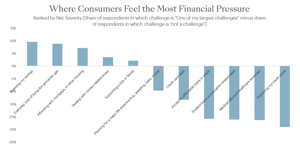 The best opportunities in consumer finance start with the biggest pain points. I asked our panel of consumers ages 18-64, living in the United States to identify their largest financial challenges, both qualitatively and through a structured list of eleven categories. Each challenge was scored by taking the share of respondents who said it was one of their largest challenges less those who said it was not a challenge, excluding those who answered in the middle (“a moderate challenge”) or said it was not relevant (for example, student debt). The highest-scoring pain points were savings, affordability, and stress.