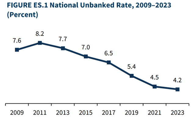 Source: Federal Deposit Insurance Corporation (FDIC), “2023 FDIC National Survey of Unbanked and Underbanked Households,” Figure 1, released October 2024.