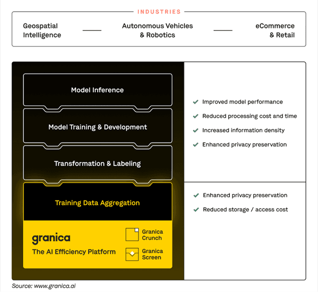 The rise of AI has driven growth in the data needed to pre-train, finetune, prompt-tune, and inference models in production, along with exploding costs across the emerging AI stack that are linked to the quantity & heterogeneity of data, size of models (parameters from the many billions to 1T+), time spent fixing model misbehaviors & drifts, and general complexity in scaling & deploying AI. Much of these costs are fundamentally driven by data inefficiency, as training data with low information value has proliferated. Such data often contains significant redundancy and sensitive information including personally identifiable information (PII) that increase costs, legal/compliance risk, and the time it takes to move data through the AI pipeline. Cutting these inefficiencies requires a new layer in the AI stack purpose-built to reduce redundant, low value, and sensitive data while increasing information density and improving the bias & performance of models. Granica is building this efficiency layer across the AI stack.