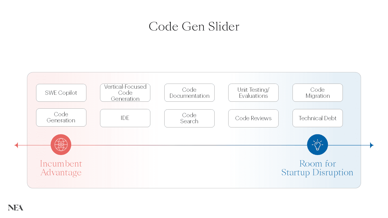 As codebases become more complex, more engineering time gets sunk into maintaining and troubleshooting old code and less goes to innovating and writing new code. For enterprises struggling to manage these codebases, switching costs provide a buffer to fend off faster-moving startups. With AI-led software development, switching costs are rapidly declining. Incumbent moats suddenly become shallower, and the need to modernize enterprise code bases becomes existential. This positions startups with a huge opportunity.