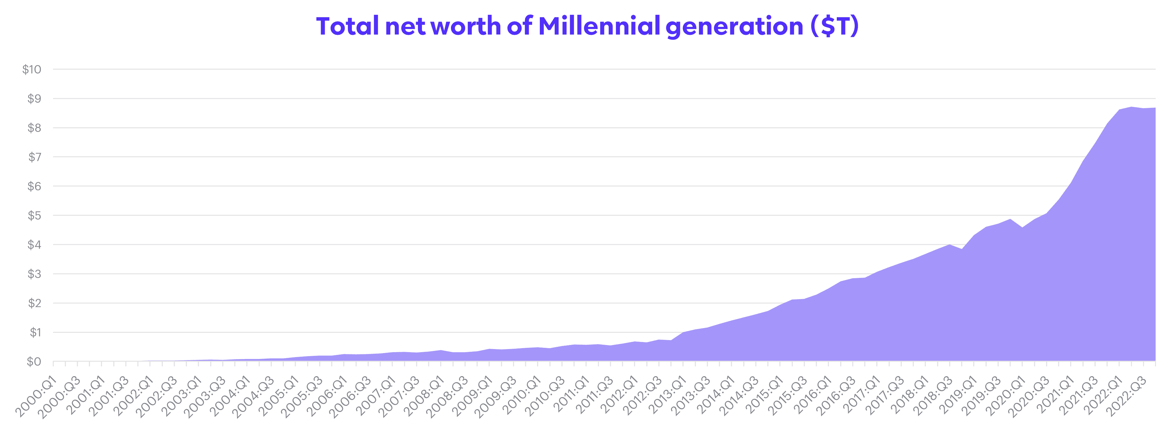 Personal finance data pegs the median annual earnings for working Gen Zers at just $32,500 [11], leaving little income for savings or investment products. But, with age and generational inheritance, these consumers will gradually accumulate more capital over time. Consider the cumulative net worth of American Millennials over the last two decades [12]: