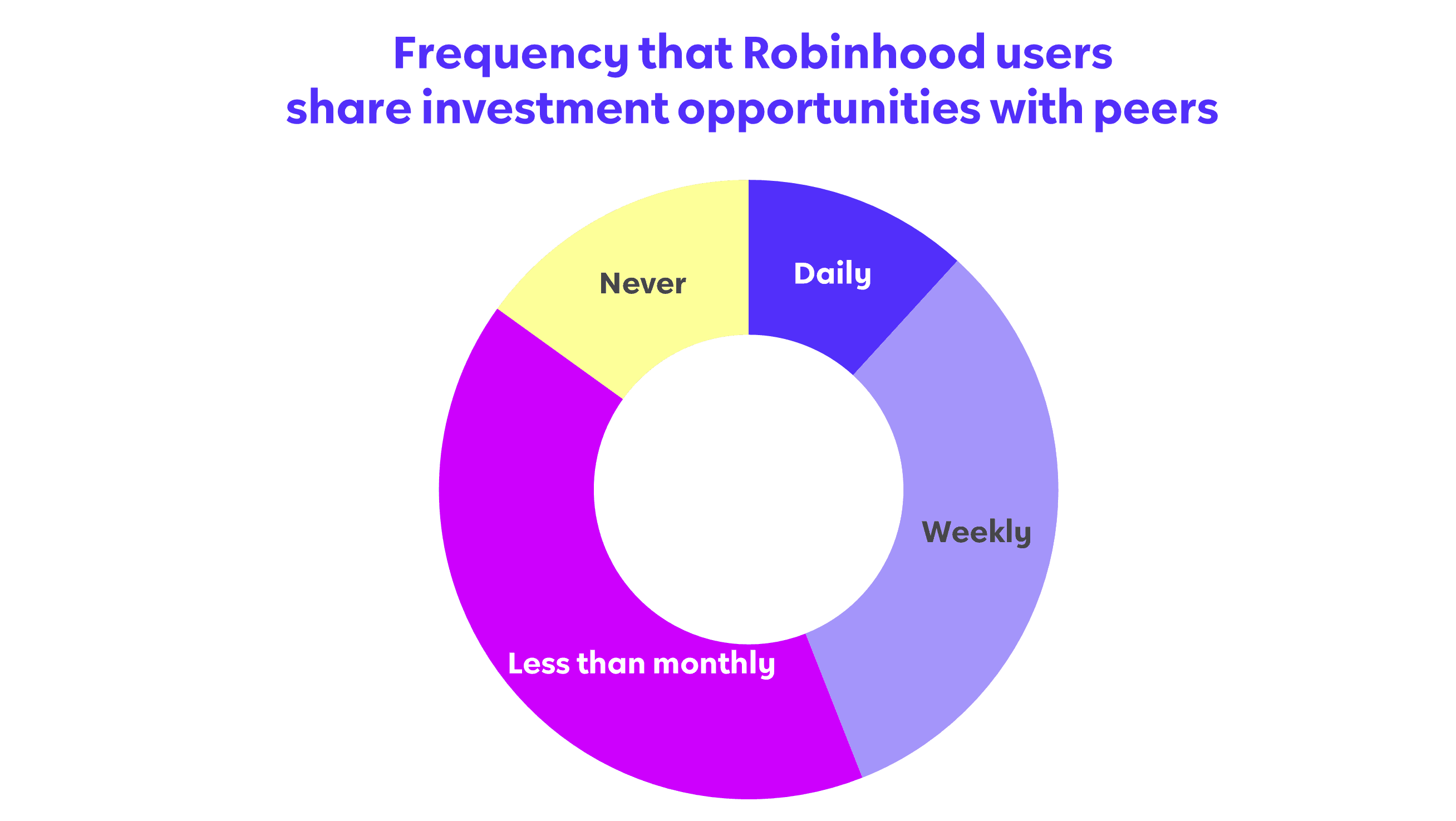 Gen Z investors are remarkably collaborative, conversational, and consultive – in other words, social. For example, of the survey respondents that use Robinhood, nearly 45% discuss investment opportunities at least weekly with their peers; another 34% share opportunities monthly. Less than 15% of survey respondents see investment details, such as how much money they invested, as private information that should not be shared with their network or community.