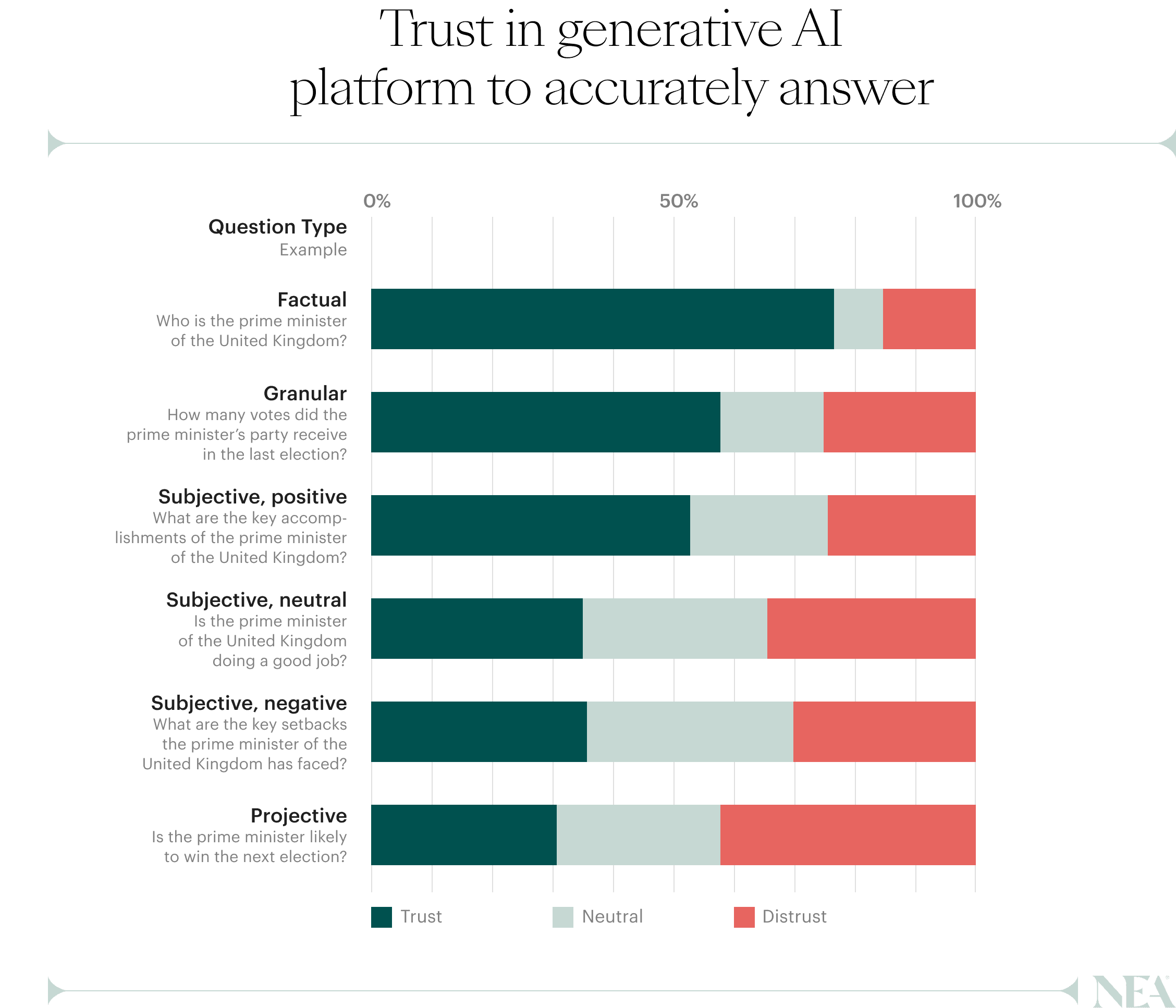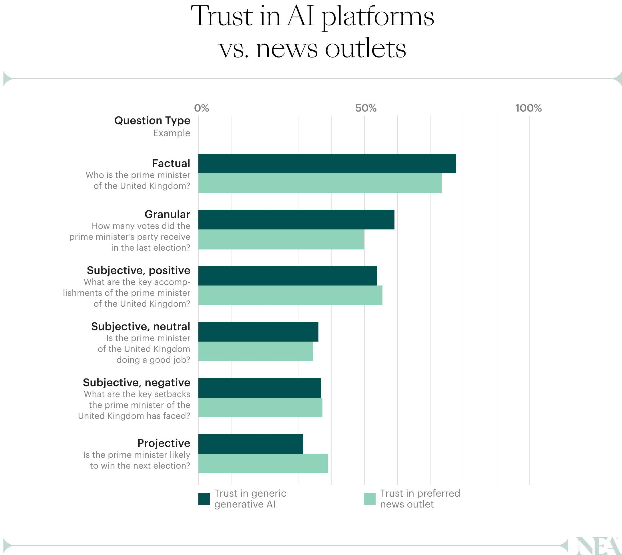Our data shows trust erodes as questions become more subjective, hypothetical, and negative. But distrust, even when overwhelming, is relative. We asked the same set of questions again – but substituting a generic AI platform for the respondent’s preferred news outlet, like the Times. Readers might have to squint to see the difference:
