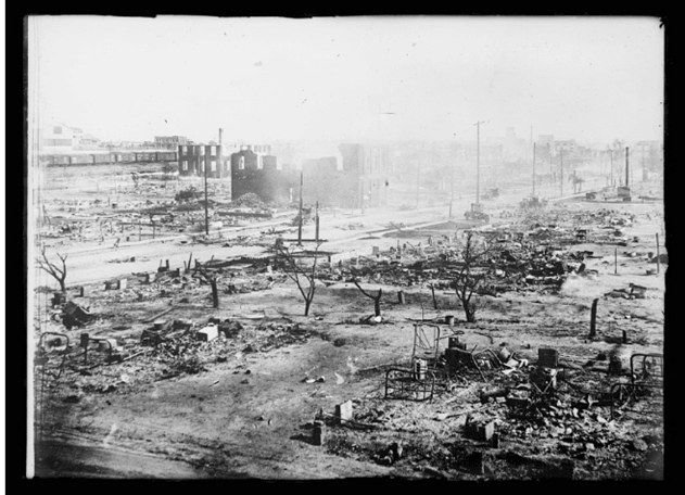 John the Baptist lost his fortune on Tuesday, May 31 of that year at 11:00 pm (or thereabouts). A white pyromaniacal mob, angered by assault accusations from a white elevator operator towards a black shoe shiner, stormed Greenwood’s central district. Stray gunshots organized into open fire. Indiscriminate looting became comprehensive. A fire grew infernal. No one knows how many died in the destruction because the authorities did not bother to keep track. But photos show 35 blocks having burned to the ground, leaving up to 10,000 residents homeless. JB’s legacy burned alongside the wooden shafts and mortar. His hotel – an Ozymandian monument to black fortune – was never recovered, nor any of his community investments.