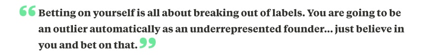 As an underrepresented founder, you are likely going to have outside labels and assumptions placed on you. And you may start to live in them. Betting on yourself it is all about breaking out of labels. You are going to be an outlier automatically as an underrepresented founder. At the end of the day, you have to truly know yourself and what your superpowers are to be successful. Just believe in you and bet on that.