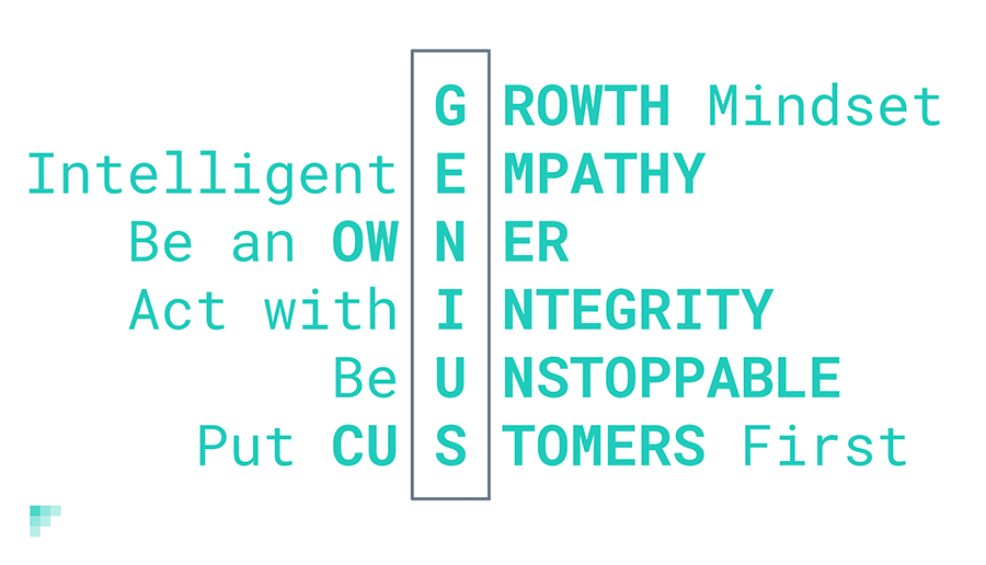 Lastly, I believe values and culture should be actionable. We know we can bring our values into everything we do, every single day. This includes things like our hiring practices and building that into performance culture. We talk about genius in our mission – enable genius in every human and in every workflow – but we actually have a “GENIUS” anagram in our values that encapsulates this for our employees.
